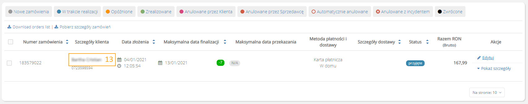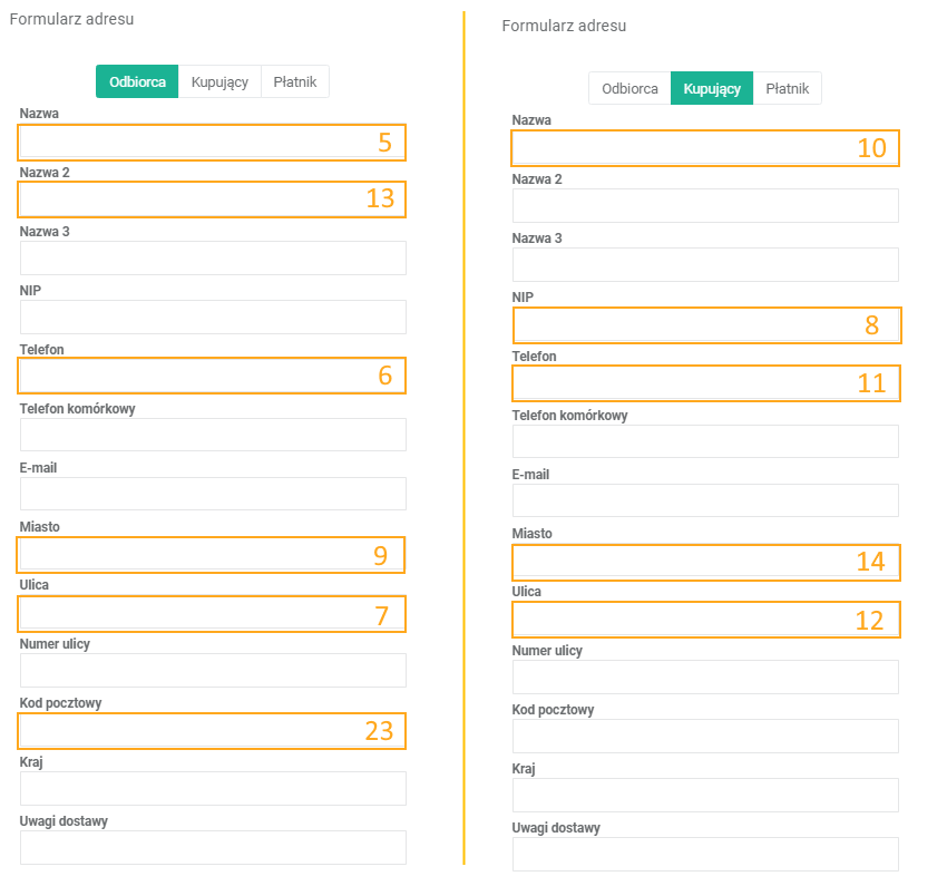 Edycja zamówienia > Formularz adresu > Odbiorca Nazwa 2 13 Lista zamówień Szczegóły klienta 13 Zależy od konta klienta. Nie widnieje bezpośrednio w edycjizamówienia.