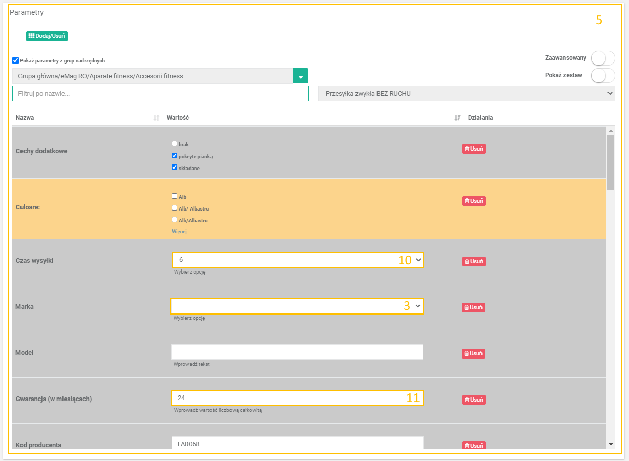 Do prawidłowego wystawienia oferty na eMag konieczne jest uzupełnienie parametrów obowiązkowych. Najczęściej są to parametry takie jak marka, kolor, rodzaj produktu i gwarancja. Jeśli jakiś parametr obowiązkowy nie zostanie uzupełniony w ofercie zostanie wyświetlony komunikat wskazujący jakiego parametru brakuje do prawidłowego wystawienia oferty.