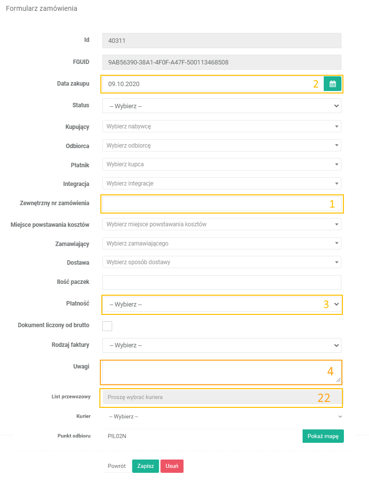 Edycja zamówienia > Formularz zamówienia Zewnętrzny nr zamówienia 1 Edycja zamówienia Zamówienie 1