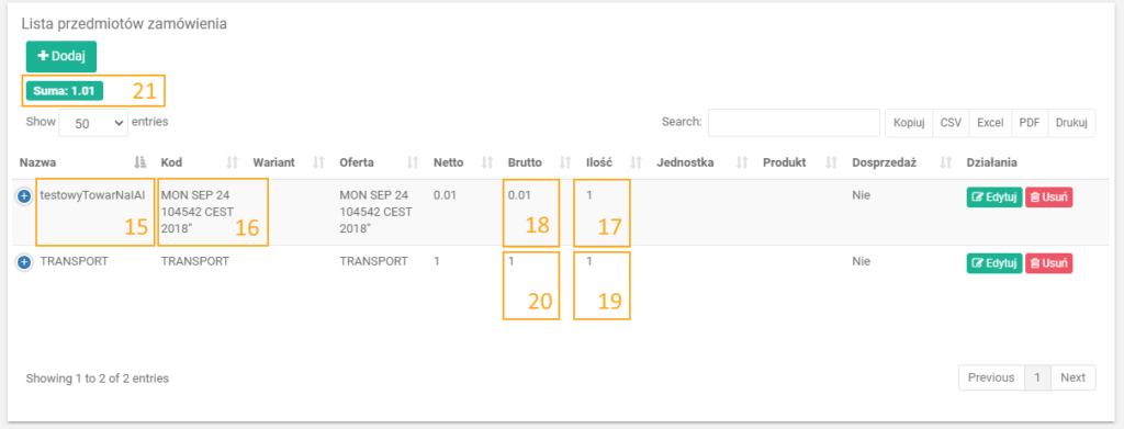 Edycja zamówienia > Lista przedmiotów zamówienia Suma 21 Szczegóły zamówienia Razem 21
