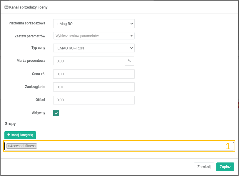 Kanały sprzedaży i ceny > Grupy Grupy 1 1. Szczegóły kategorii i produktu Kategoria 1 Można przekazywać tylko jedną grupę.