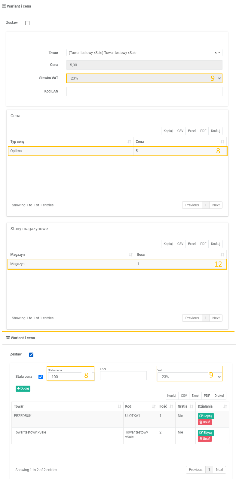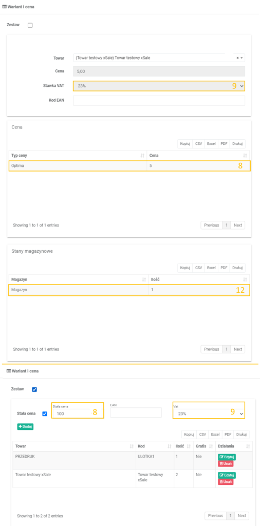 Warianty i cena > VAT; Warianty i cena > Zestaw > VAT Stawka VAT 9 6. Cena i stan magazynowy VAT 9