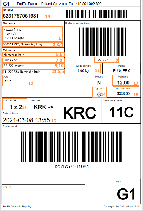 Poniższa tabela prezentuje zakres przesyłanych między xSale a FedEx danych na przykładzie wygenerowanej etykiety.