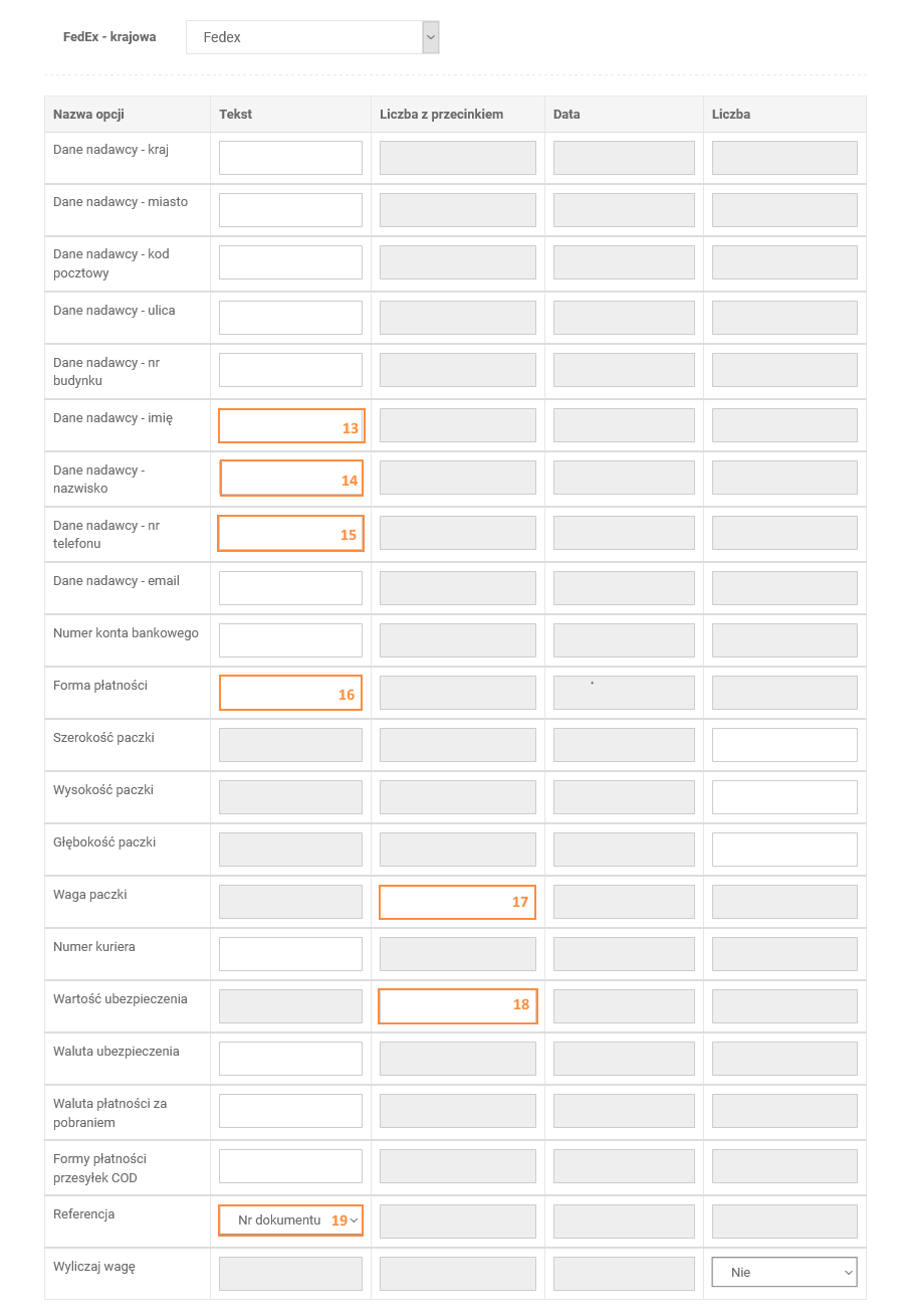 ShipmentTask > Edycja FedEx Formy płatności 16 Typ płat. 14