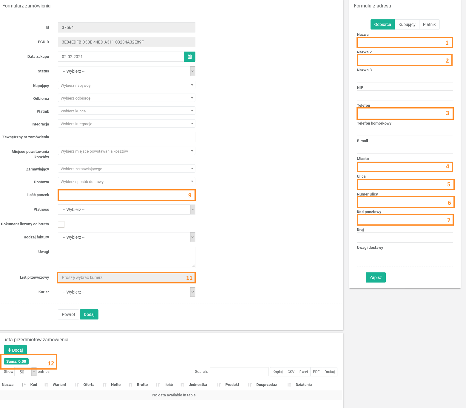 Formularz zamówienia > Formularz adresu > Odbiorca Nazwa 1 Odbiorca Imię 6