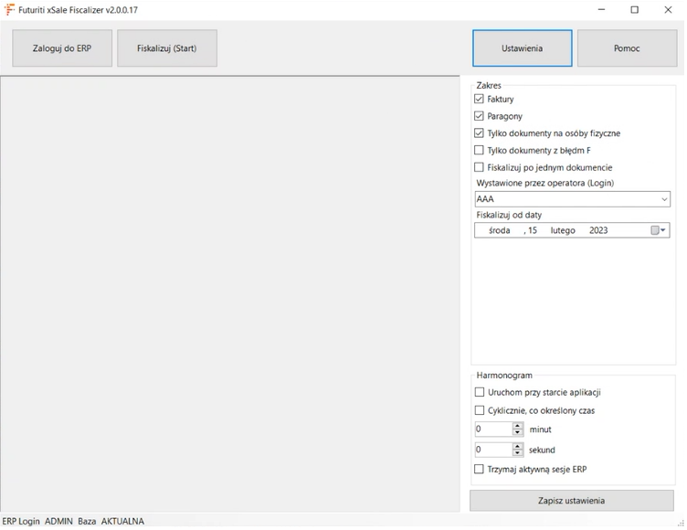 • Sekcja Harmonogram pozwala na ustawienie automatycznego trybu fiskalizacji.