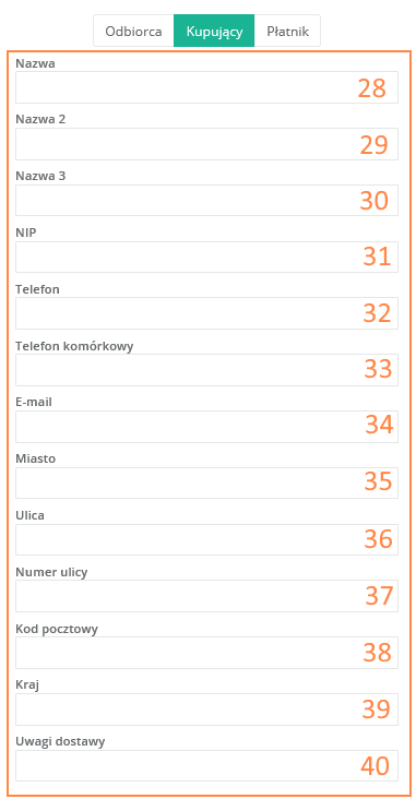 | Edycja zamówienia > Formularz adresu > Kupujący | NIP | 31 | Lista zamówień > Operacje > Stwórz przesyłkę > Kupujący > Edytuj adres kupującego | Nr podatkowy | 39 |