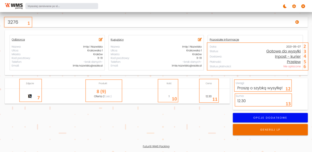 | Edycja zamówienia > Lista płatności | Płatność | 13 | Lista zamówień > Operacje > Stwórz przesyłkę | Status płatności | 6 |