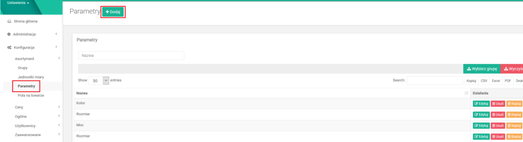 - W celu dodania parametru wejdź w menu Konfiguracja –> Asortyment –> Parametry i kliknij przycisk +Dodaj.