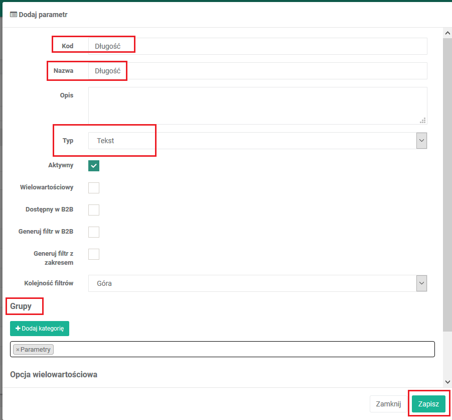 - W polu Grupy dodaj parametr do właściwej grupy z IAI. Jeden parametr może być przypisany do kilku grup w IAI.