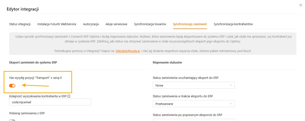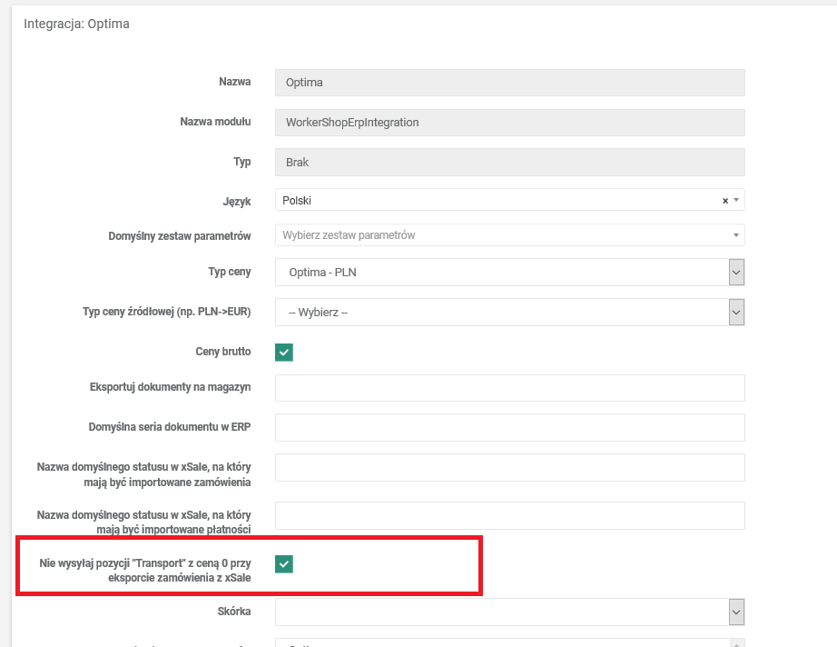 Opcja Nie wysyłaj pozycji „Transport” z ceną 0 przy eksporcie zamówienia z xSale pozwala pominąć taką pozycję podczas eksportu zamówienia do ERP.