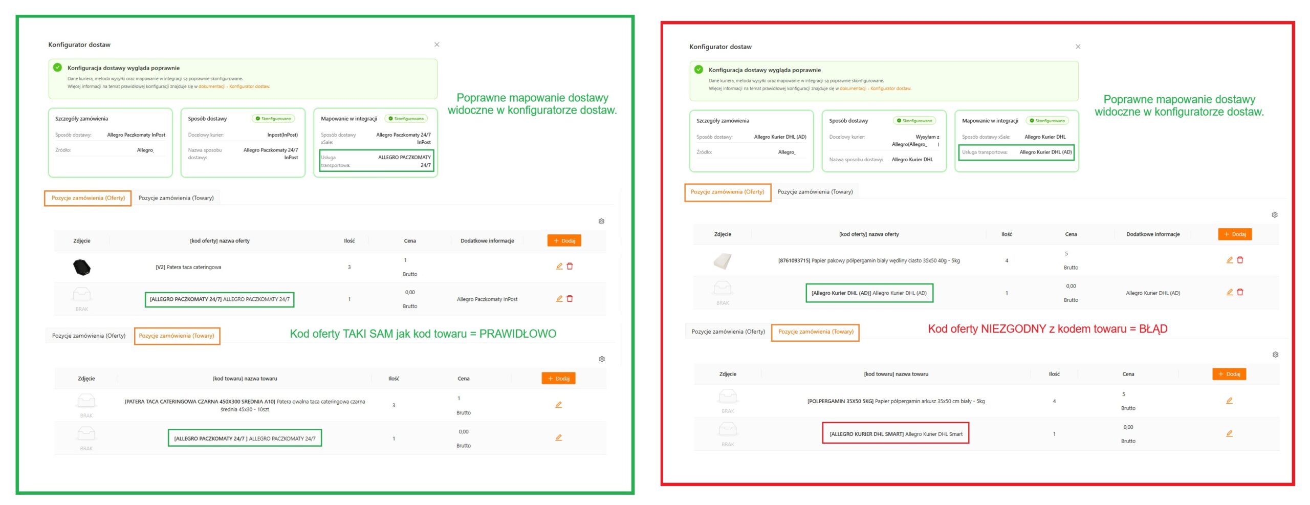 Na kolejnym screenie pokazano dwa scenariusze: prawidłowe ustawienie oraz sytuację z błędem lub niezgodnością, którą trzeba zweryfikować na zamówieniu i w mapowaniu dostawy.