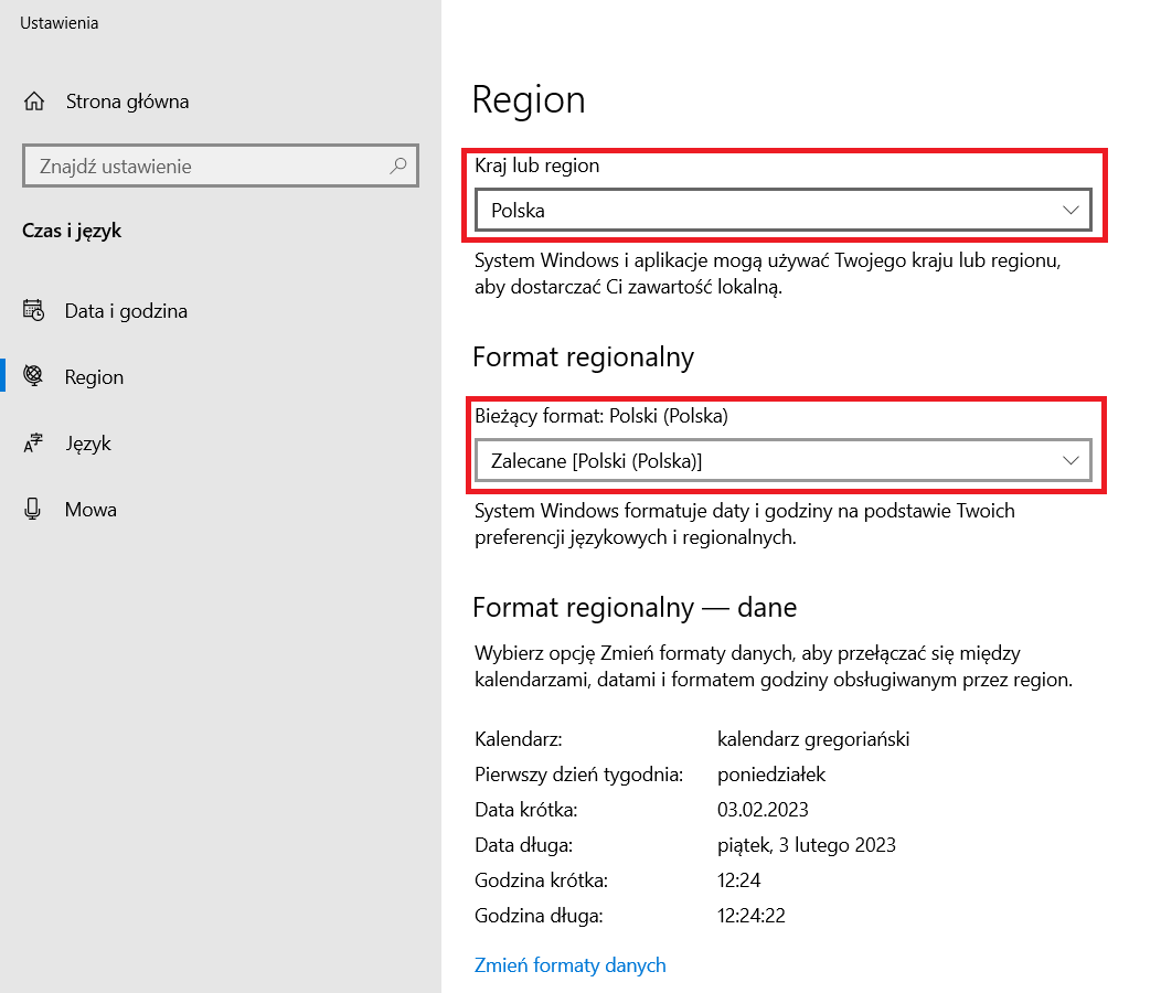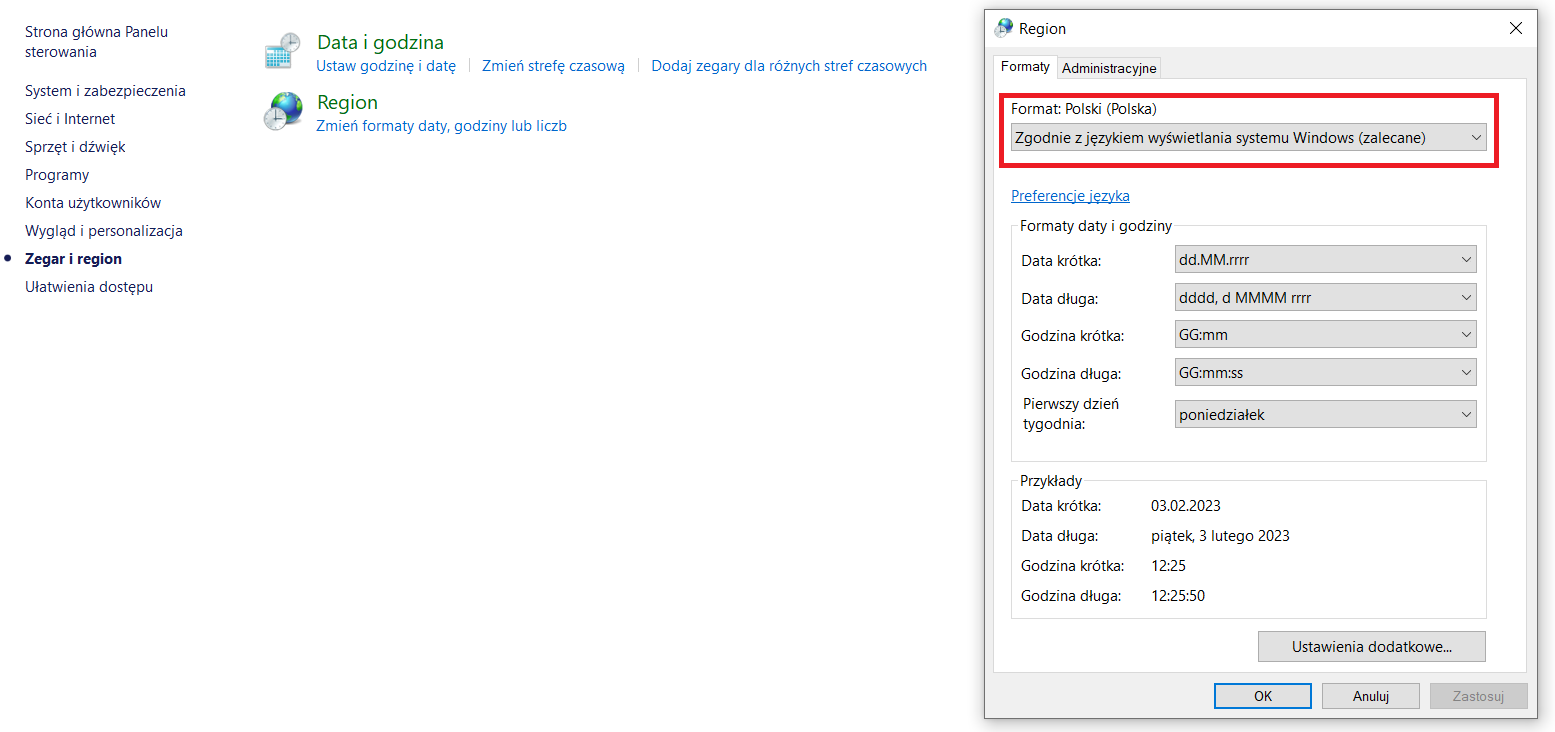1. Panel sterowania \ Zegar i region \ Region \ Format: Polski (Polska)