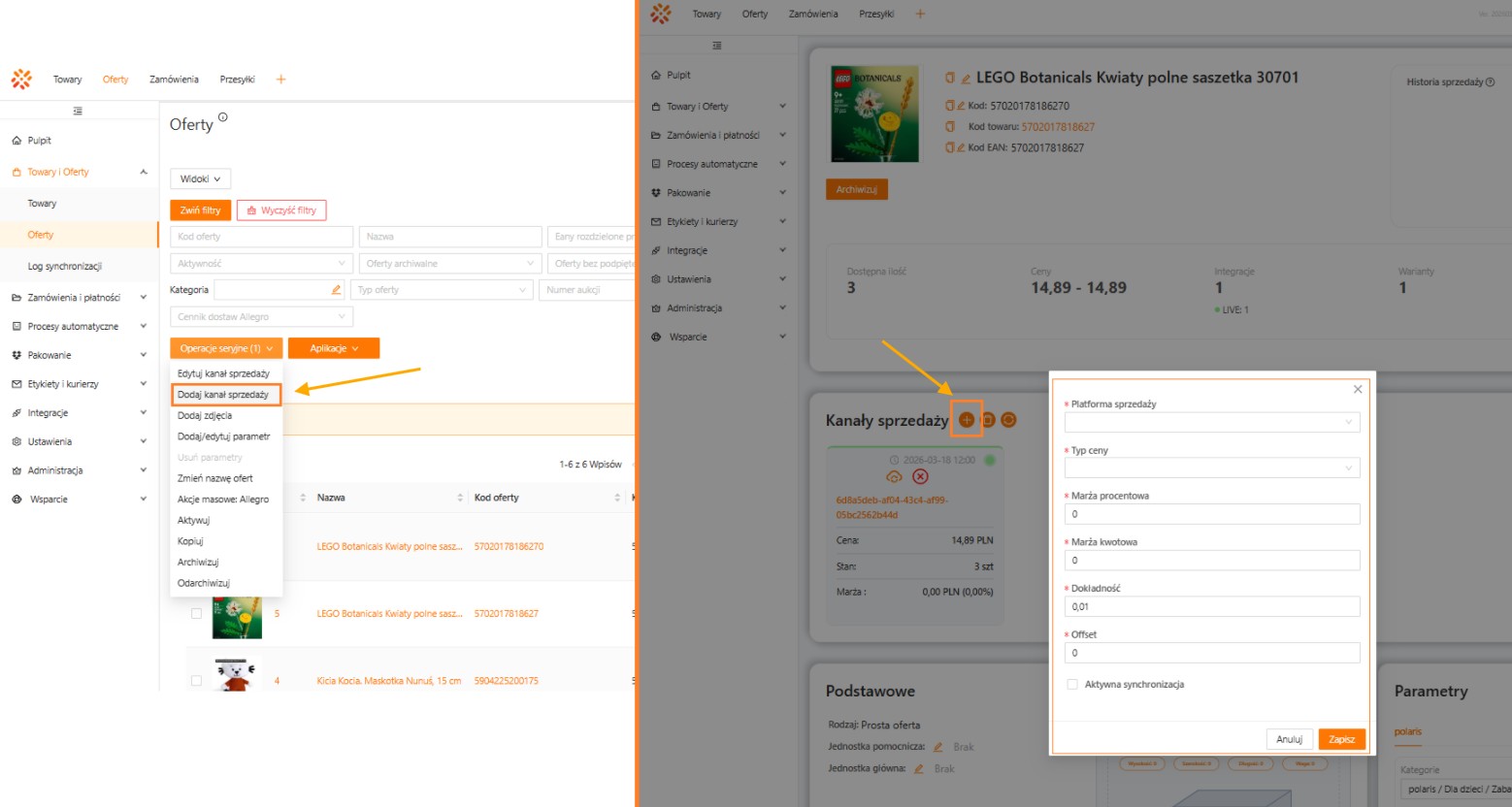 - bezpośrednio na karcie oferty, klikając + w sekcji Kanały sprzedaży.
