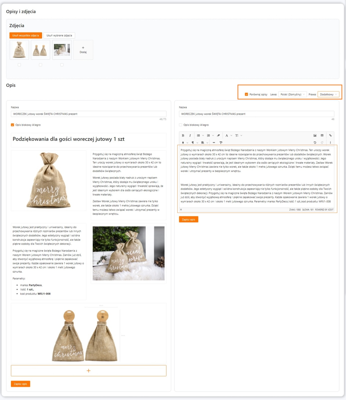 Przejdź na ofertę, dla której chcesz przygotować dodatkowy opis, a następnie otwórz sekcję Opisy i zdjęcia. Skorzystaj z opcji Porównaj opisy i wybierz z jednej strony dotychczasowy, rozbudowany opis, a z drugiej nową zakładkę, którą utworzyłaś w językach.