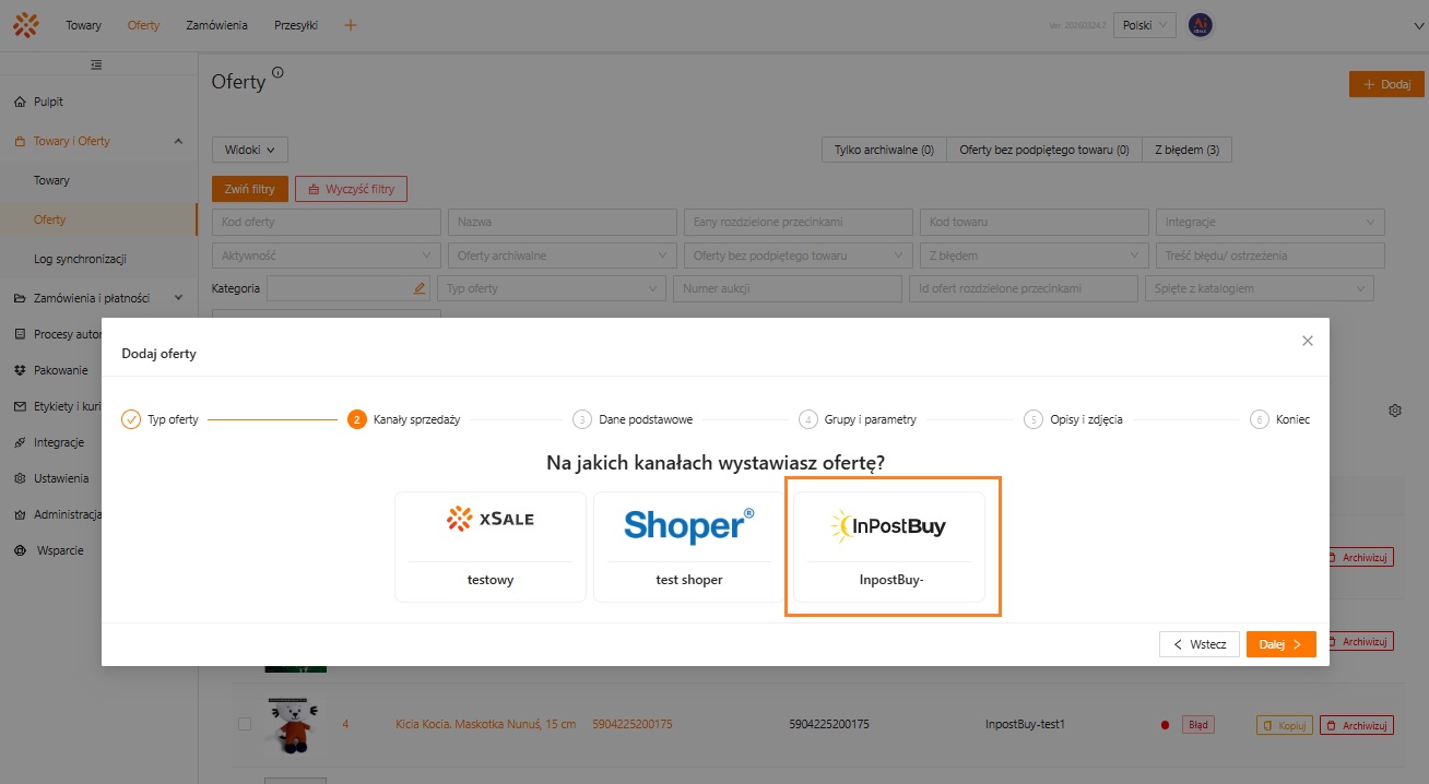 Wystawianie ofert w InPost Buy odbywa się w xSale w standardowym procesie tworzenia oferty. Nie jest to osobny, odrębny kreator oferty – kanał InPost Buy wybierasz podczas dodawania oferty jako jeden z kanałów sprzedaży.