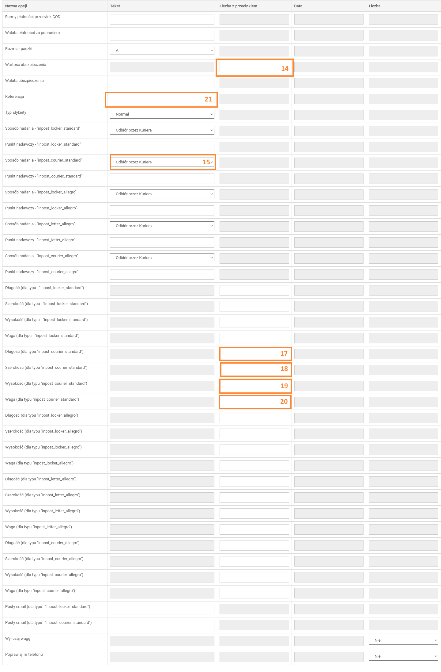 | ShipmentTask > Edycja InPost | Waga (dla typu „inpost_courier_standard”) | 20 | Waga | Waga | 14 | |