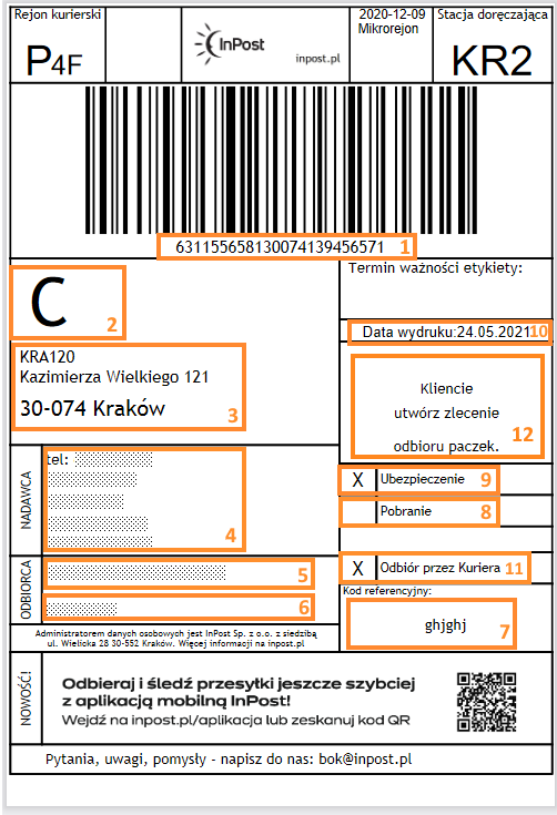 Poniższa tabela prezentuje zakres przesyłanych między xSale a InPost danych na przykładzie wygenerowanej etykiety.