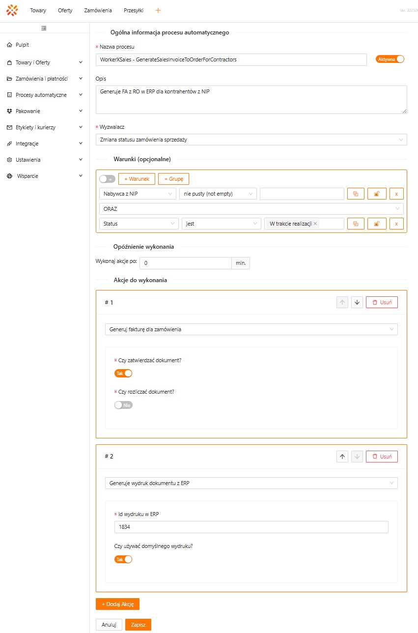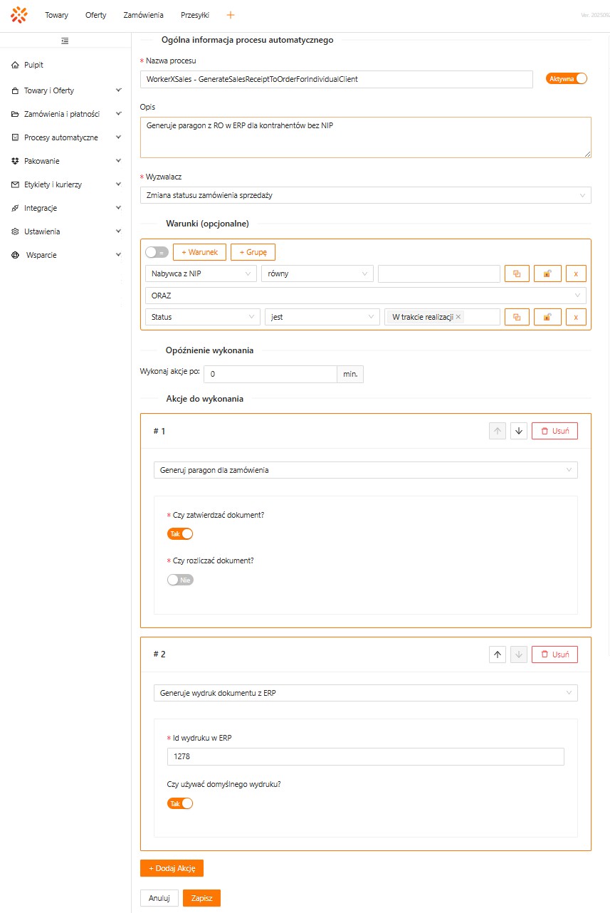 Nazwa procesu automatycznego – WorkerXSales – GenerateSalesReceiptToOrderForIndividualClient