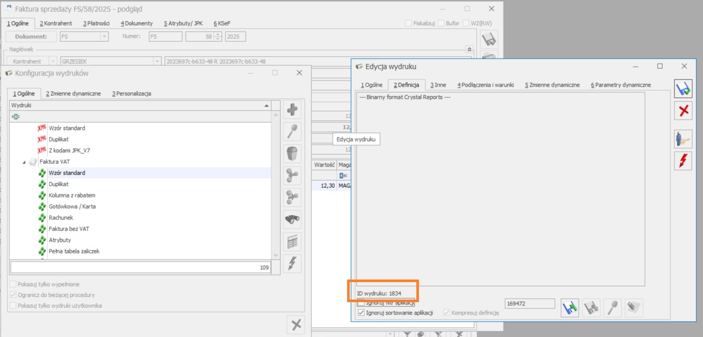 W wybranym oknie, na dole widoczny jest ID wydruku. Standardowo w przypadku faktur ID to 1834, a w przypadku paragonów ID to 1278.