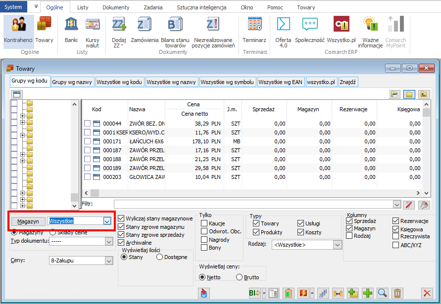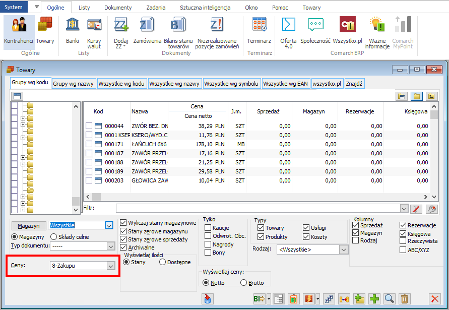 Listę typów cen znajdziesz w zakładce Ogólne -> Towary. Podaj jakie cenniki mają być pobierane do xSale.