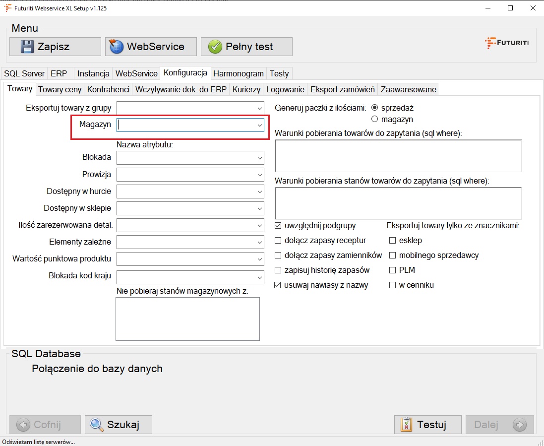 Magazyny z ERP znajdziesz w Futuriti WebService, w zakładce Konfiguracja, sekcja Towary: