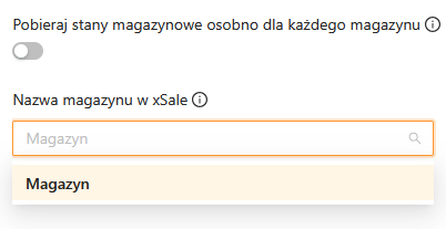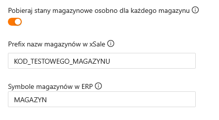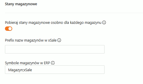W przypadku, gdy chcesz pobierać stany magazynowe indywidualnie dla każdego magazynu, w pierwszym polu podaj kod magazynu w xSale, a w drugim polu wypisz po średniku, symbole wszystkich magazynów w ERP, których stany chcesz pobierać.