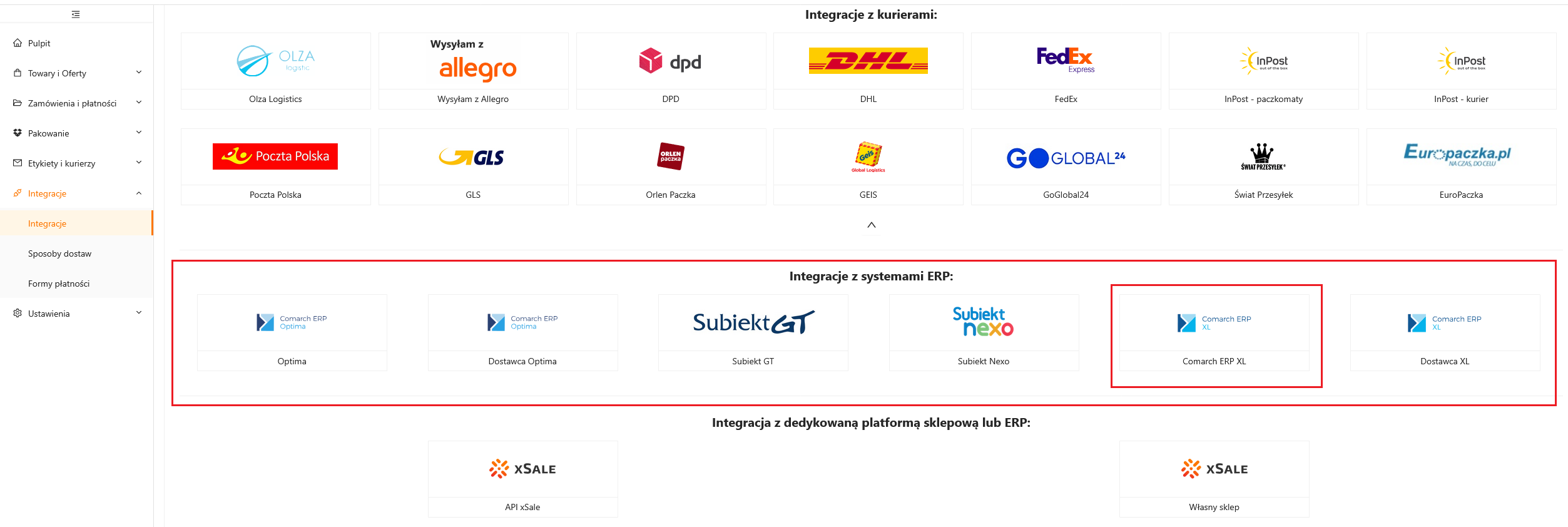 W pierwszym kroku konfiguratora integracji wybierz kafelek Comarch ERP XL z listy dostępnych integracji w sekcji Integracje z systemami ERP, w panelu xSale V2.