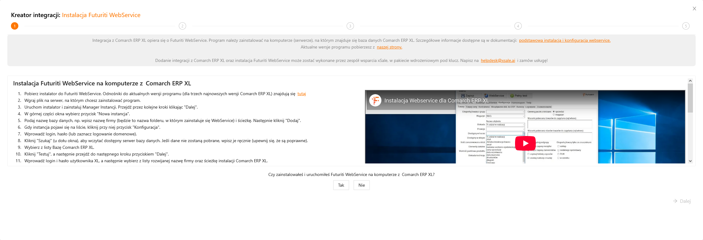 W pierwszym kroku przedstawiono kroki dotyczące instalacji Futuriti WebService na komputerze z zainstalowanym Comarch ERP XL. W linku do filmu znajdziesz szczegółową instrukcję z instalacji programu.