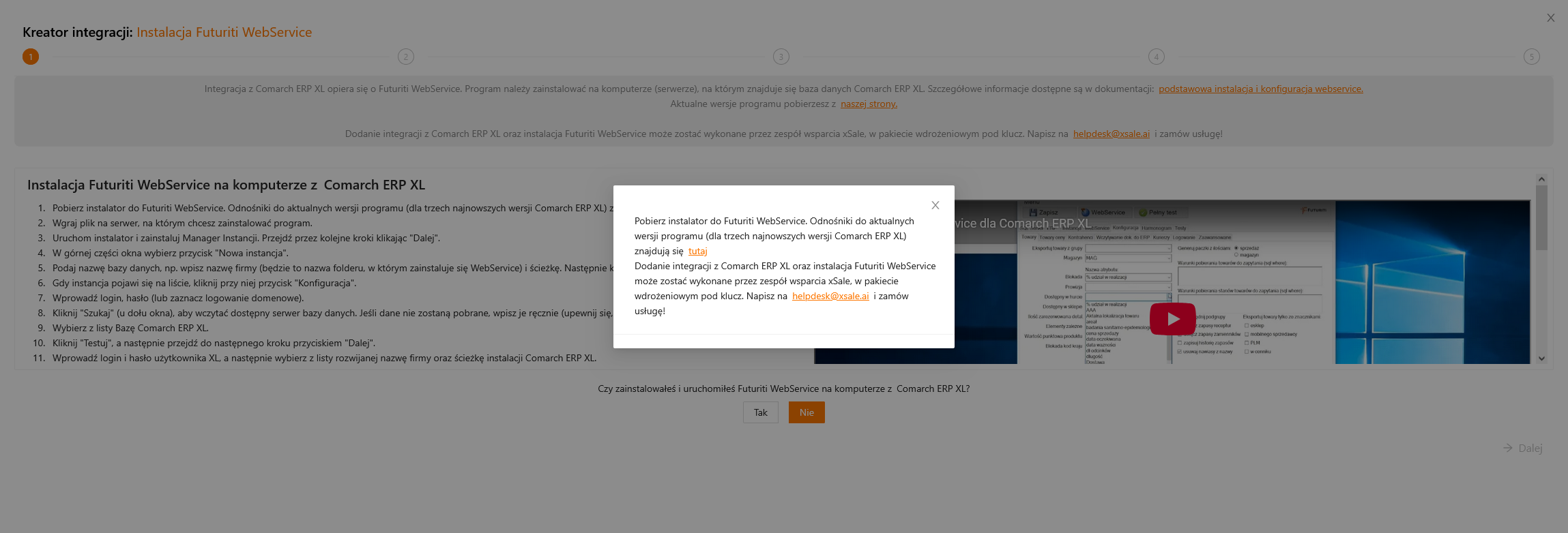 W dolnej sekcji kreatora wyświetla się pytanie: „Czy zainstalowałeś i uruchomiłeś Futuriti WebService na komputerze z Comarch ERP XL?”. Jeżeli wybierzesz opcję „Nie”, system wyświetli komunikat zawierający link do pobrania instalatora programu, który rozpocznie instalację oprogramowania na komputerze z Comarch ERP XL.