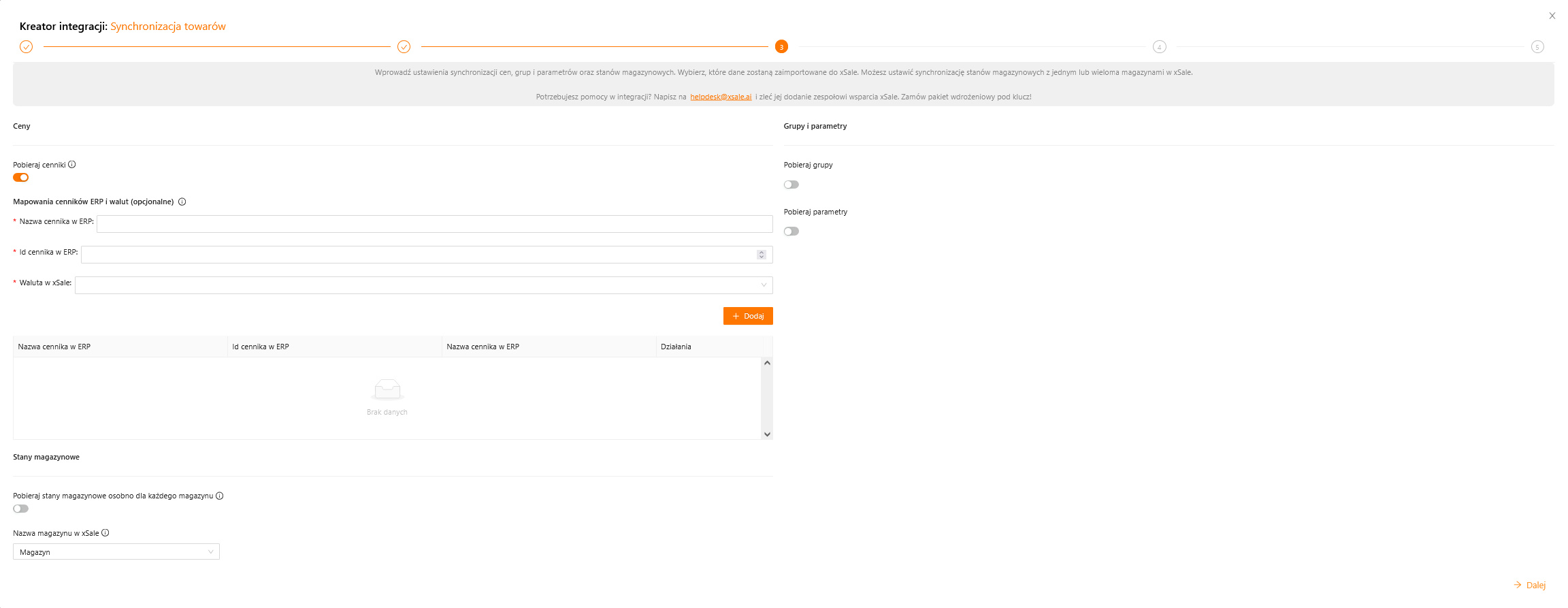Pobranie cenników jest wymagane, natomiast grupy i parametry są opcjonalne.