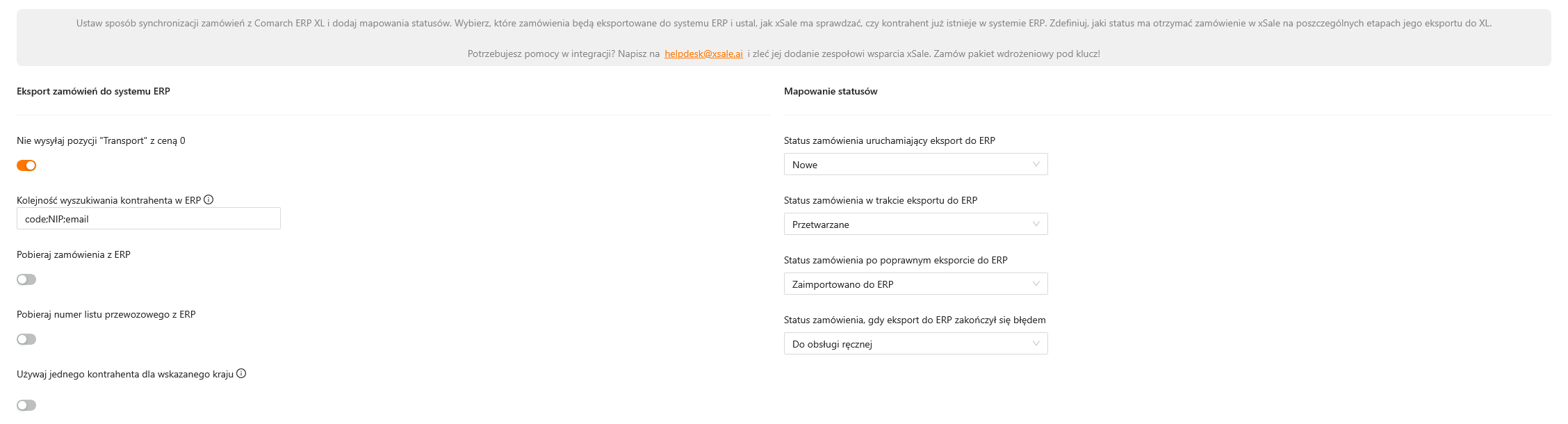 Mapowanie statusów – w tej sekcji ustaw na jakie statusy mają występować wskazane akcje zamówienia, np. status w xSale Nowe uruchomi eksport zamówienia do ERP.