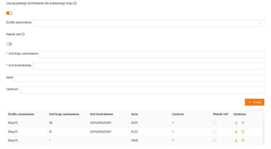 - Płatnik VAT – dotyczy zamówień, w których klient nie podał numeru NIP. Dla takich zamówień możesz osobno skonfigurować serię i centrum. Możesz użyć znaku gwiazdki „*” oznacza on „wszystkie inne kraje”.