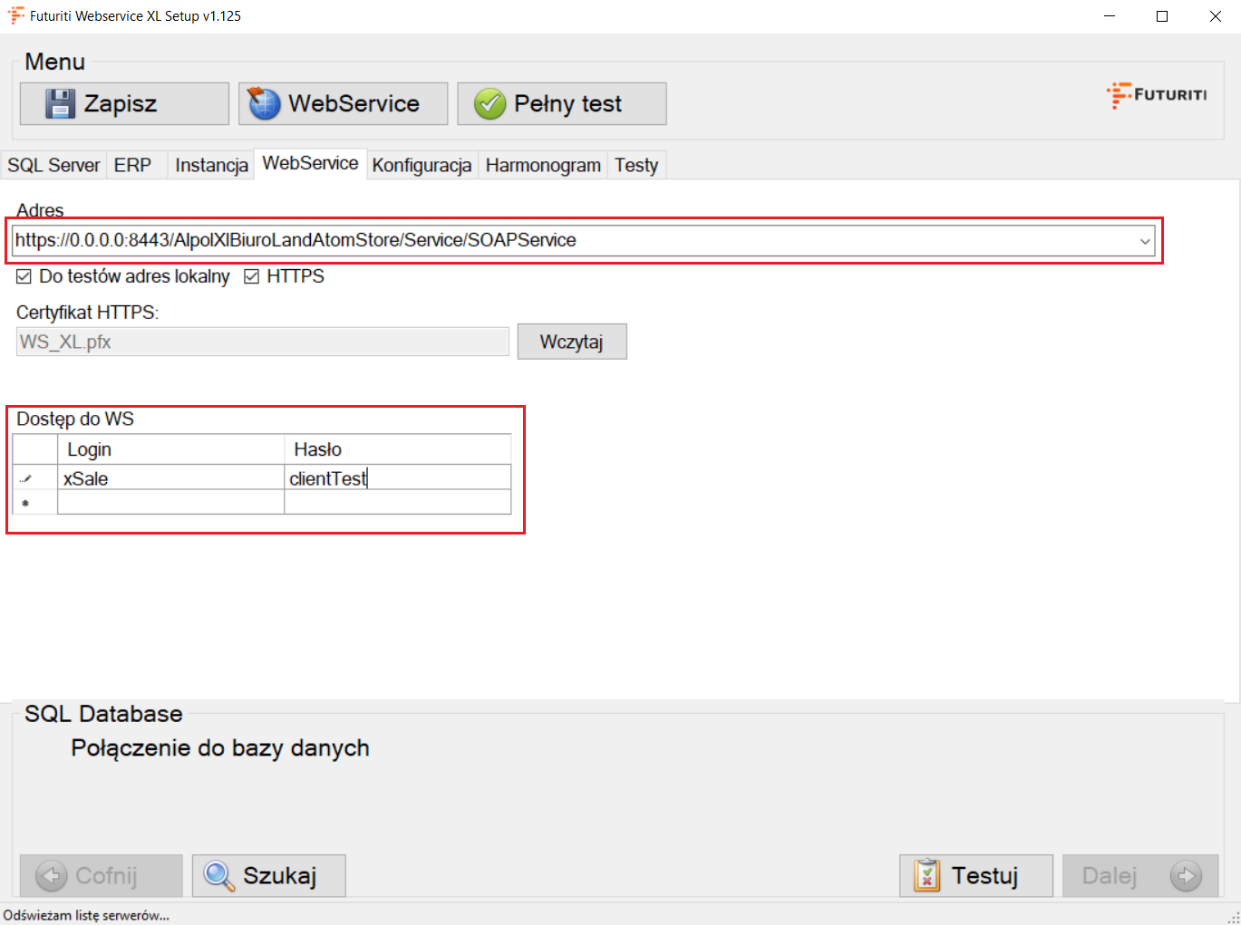 Adres IP serwera, login i hasło znajdziesz w programie Futuriti WebService XL, w zakładce WebService: