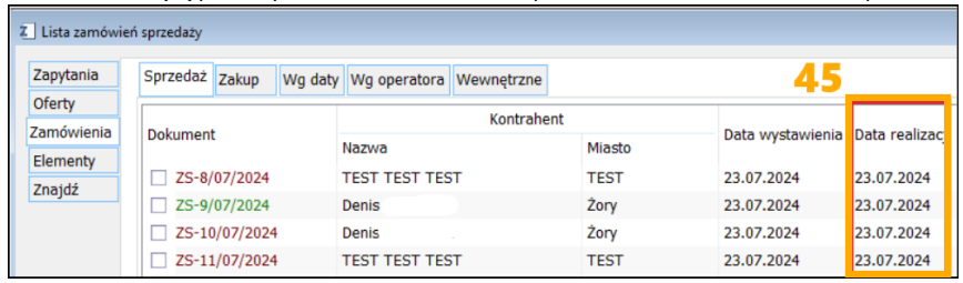 | Edycja zamówienia > Formularz zamówienia | Termin wysyłki | 12 | Lista zamówień sprzedaży | Data realizacji | 45 | |