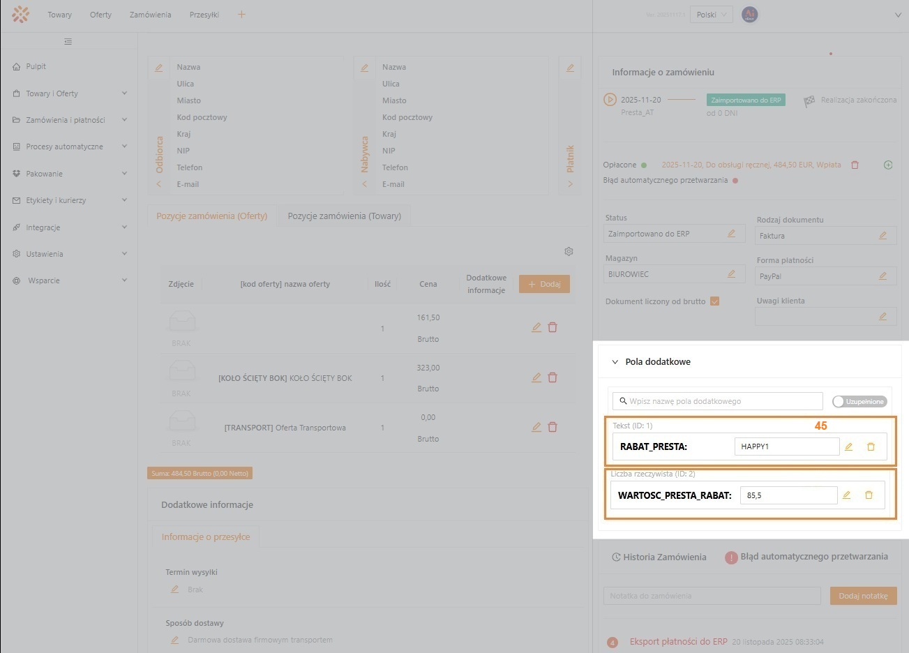 - wartości z pól dodatkowych, które są odpowiednio skonfigurowane (W integracji z ERP)