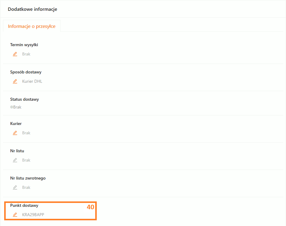 | Edycja zamówienia > Formularz zamówienia | Punkt dostawy | 40 | Edycja Zamówienia sprzedaży > Ogólne | Punkt odbioru | 38 | |