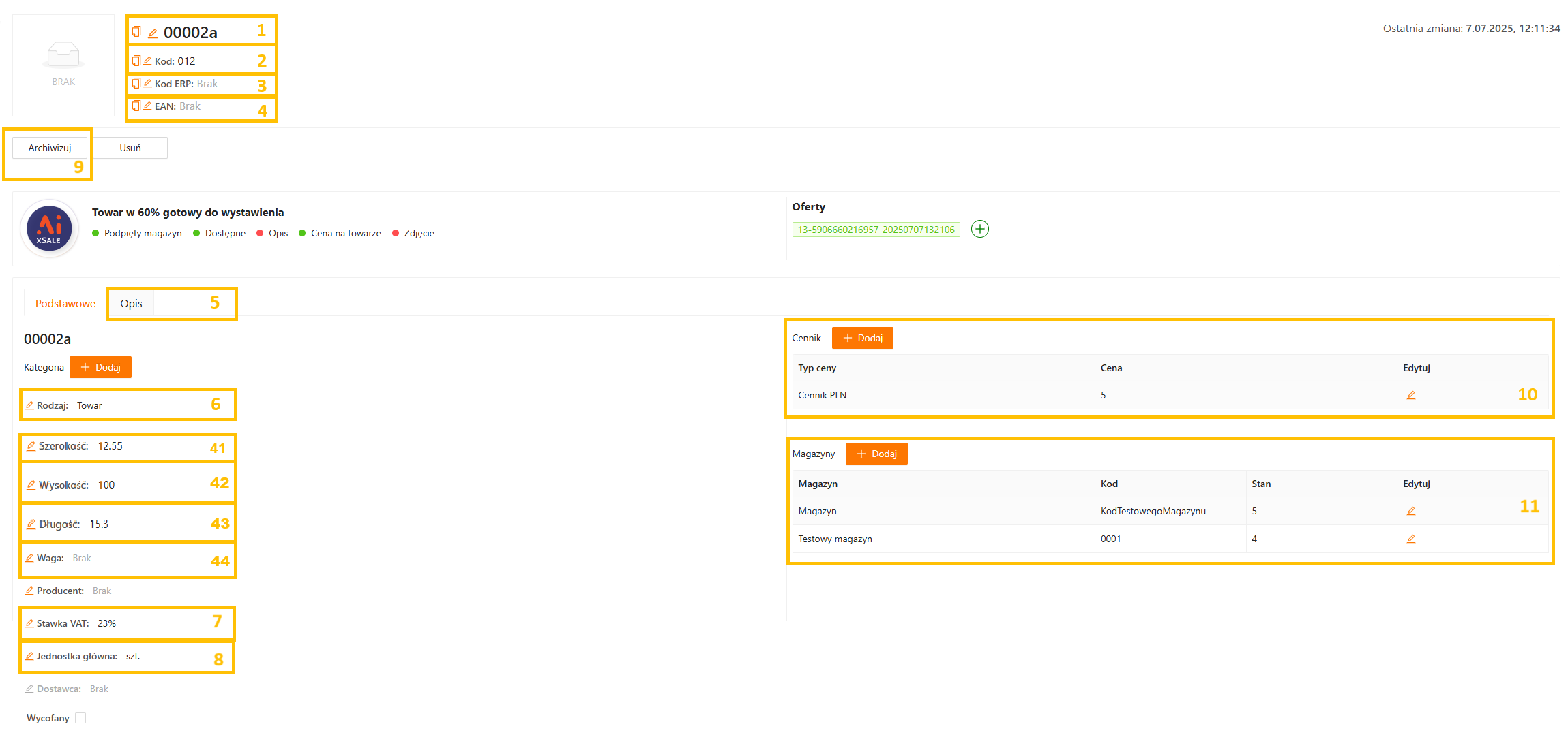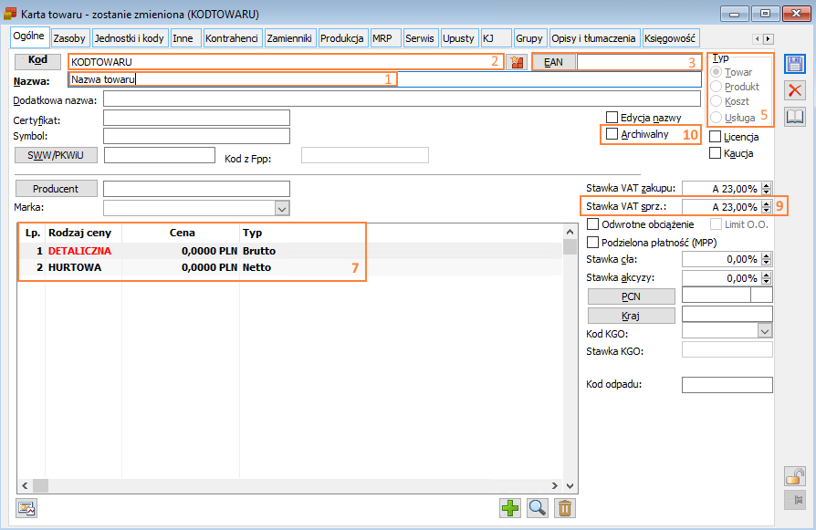| Towary > Edytuj towar | Archiwizuj | 9 | Ogólne > Towary > Edycja karty towaru > Ogólne | Archiwalny | 10 | |