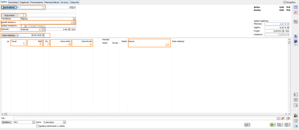 | Edycja zamówienia > Lista przedmiotów zamówienia | Cena | 39 | Edycja Zamówienia sprzedaży > Ogólne | Cena brutto | 9 | |