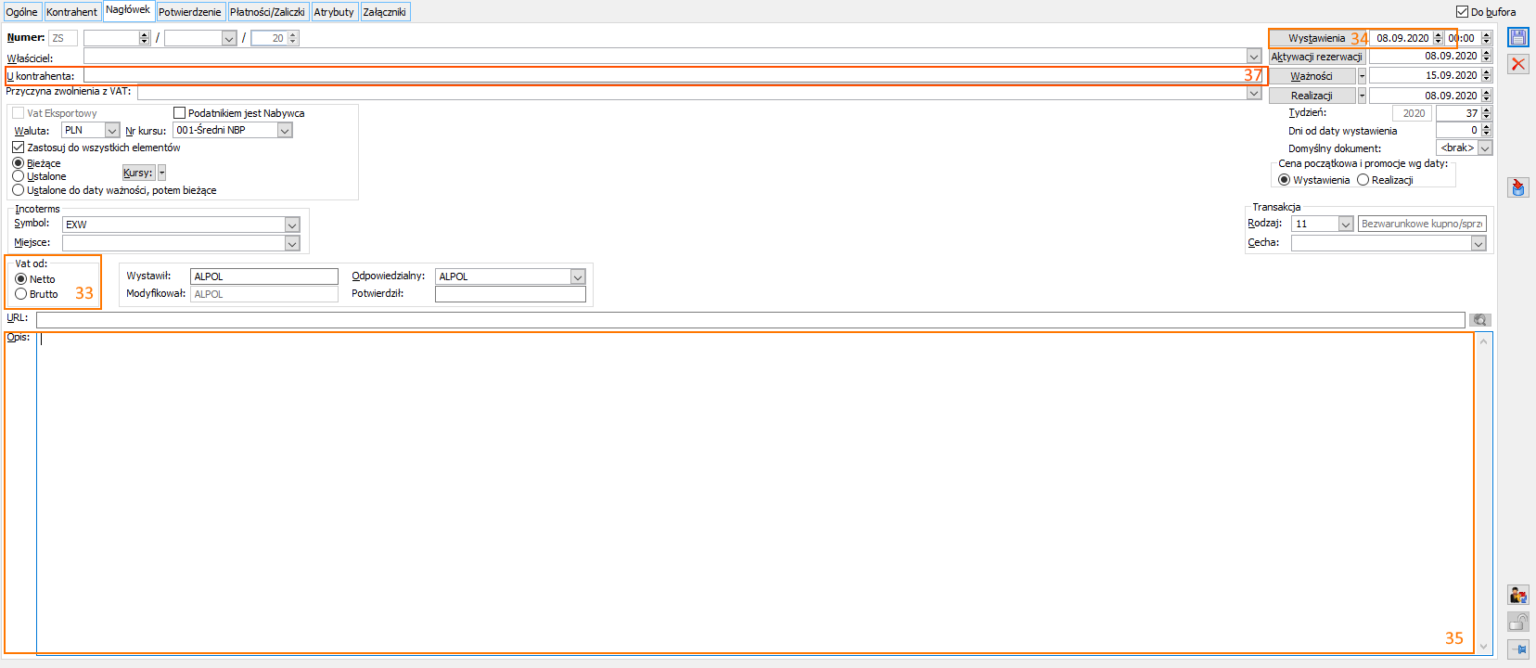 | Edycja zamówienia > Formularz zamówienia | Dokument liczony od brutto | 9 | Edycja Zamówienia sprzedaży > Nagłówek | Vat od | 33 | |