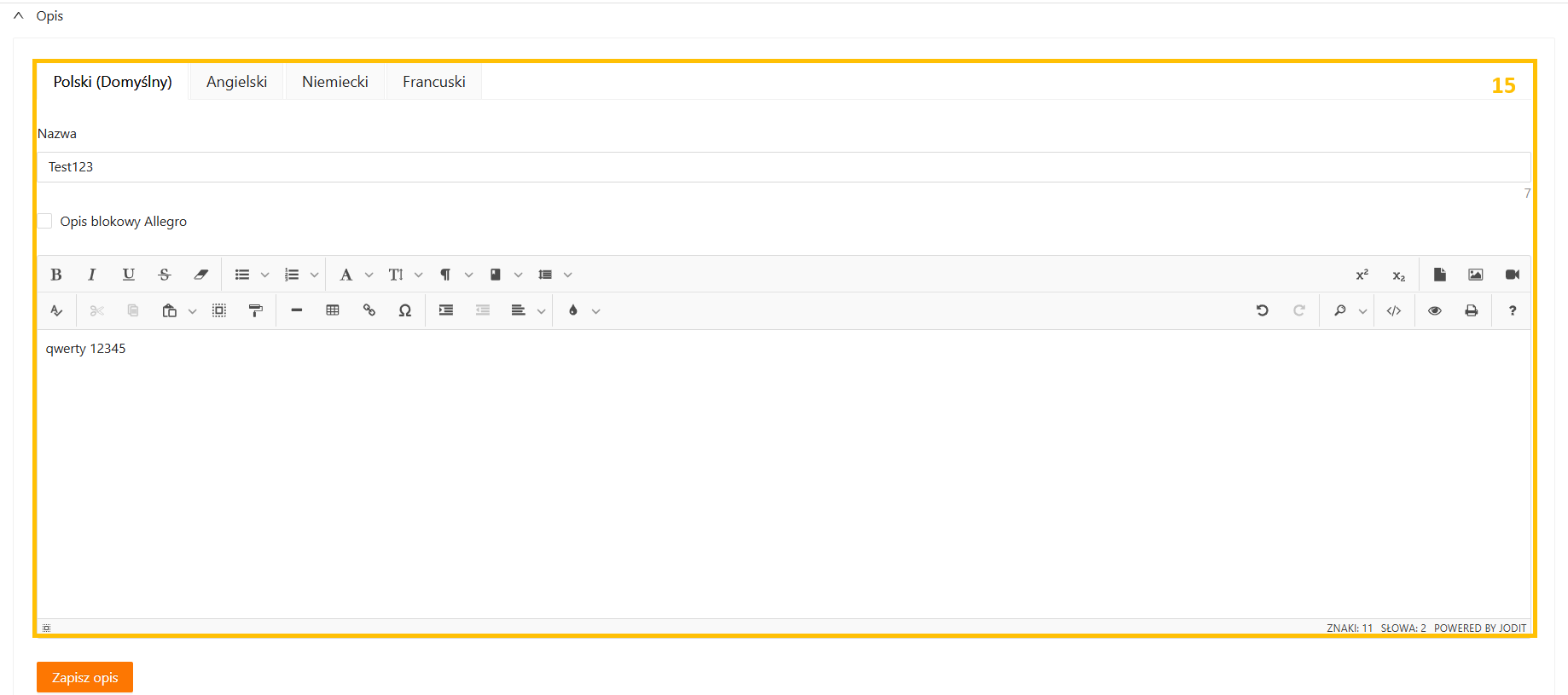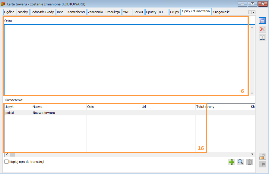 | Towary > Edytuj towar | Opis | 5 | Ogólne > Towary > Edycja karty towaru > Opisy i tłumaczenia | Opis | 6 | |