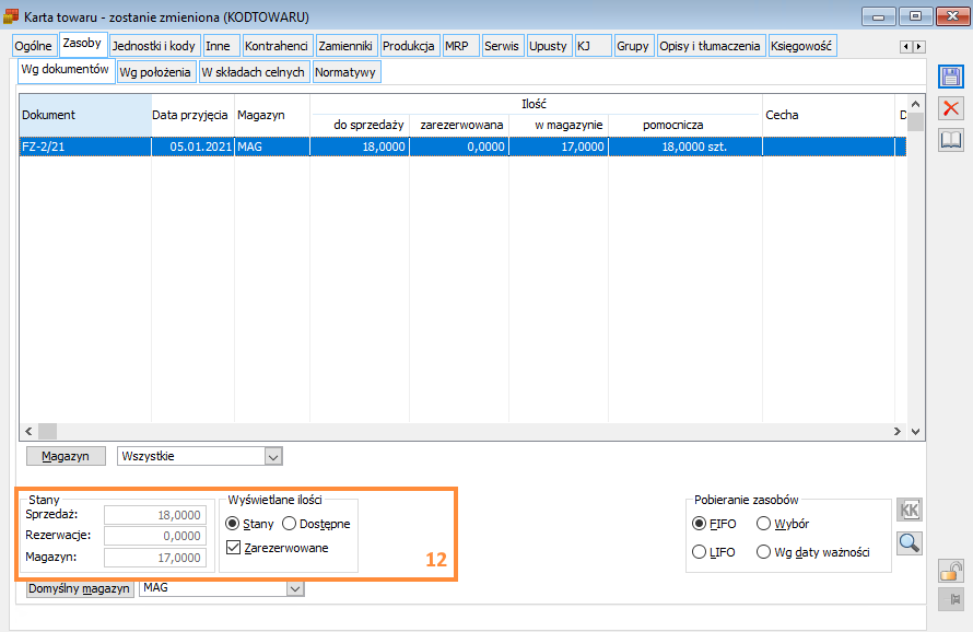 | Towary > Edytuj towar > Stany magazynowe | Magazyn | 11 | Ogólne > Towary > Edycja karty towaru > Zasoby > Wg dokumentów | Stany Sprzedaż/ Magazyn | 12 | Stan stan pobierany jest według magazynów wskazanych w konfiguracji Webservice według ilości magazynowych lub sprzedażowych zgodnie z konfiguracją. |