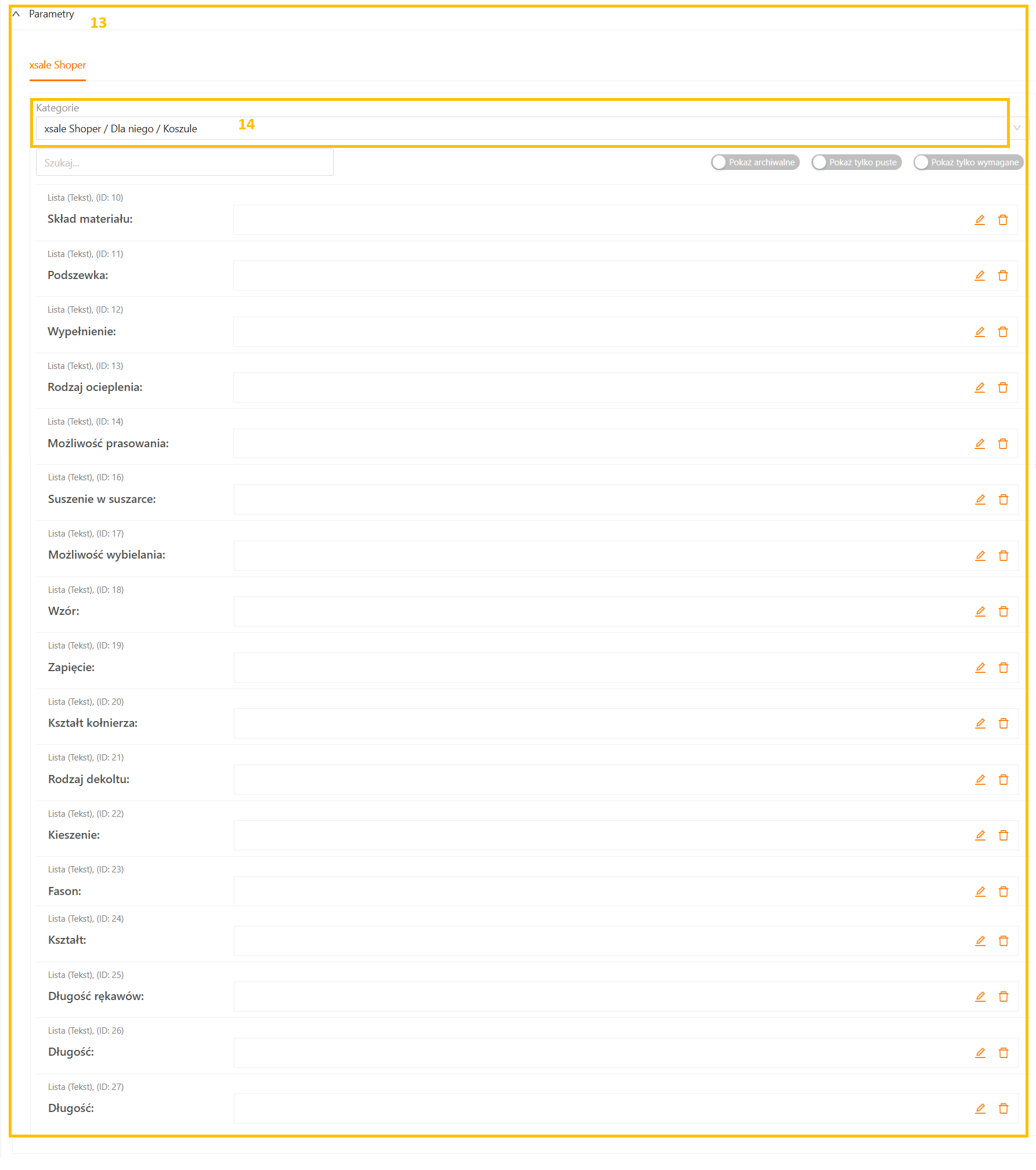 | Towary > Edytuj towar > Dodaj parametr | Parametry | 13 | Ogólne > Towary > Edycja karty towaru > Atrybuty | Atrybuty | 14 | Wymaga włączenia synchronizacji grup i parametrów z ERP w konfiguracji xSale |