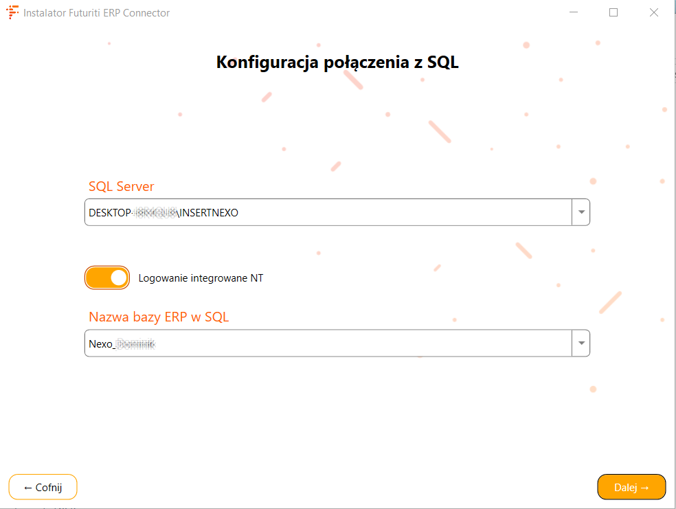 - Logowanie integrowane NT – czy używać logowania NT zamiast danych konta SQL