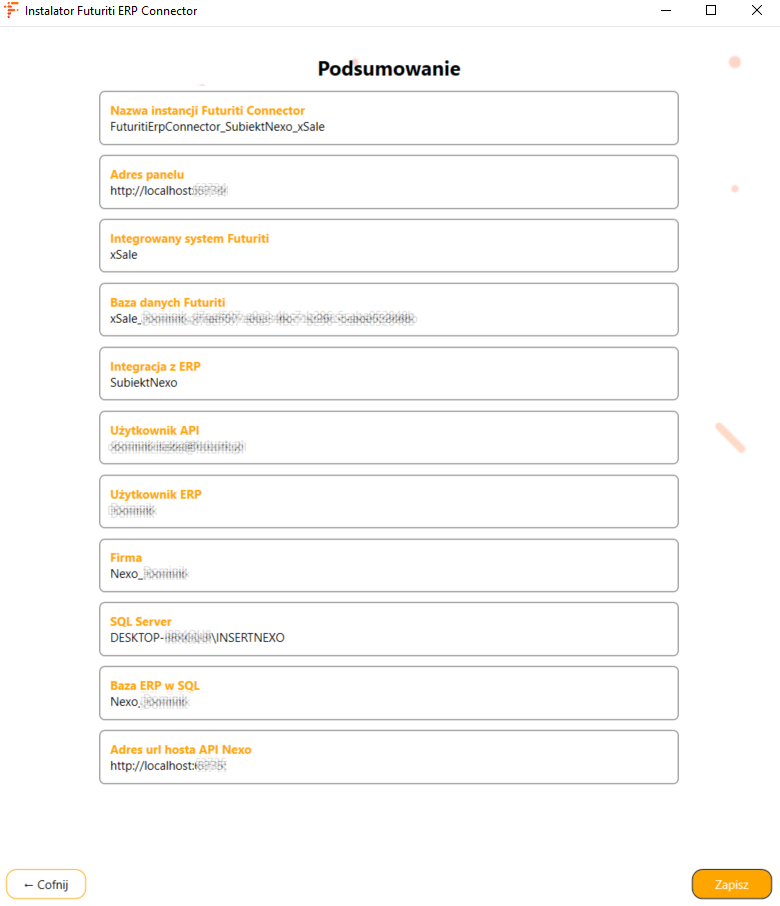 - Jeśli w podsumowaniu nie ma żadnych niezgodności Zapisz konfigurację, Futuriti Connector będzie gotowy do instalacji.