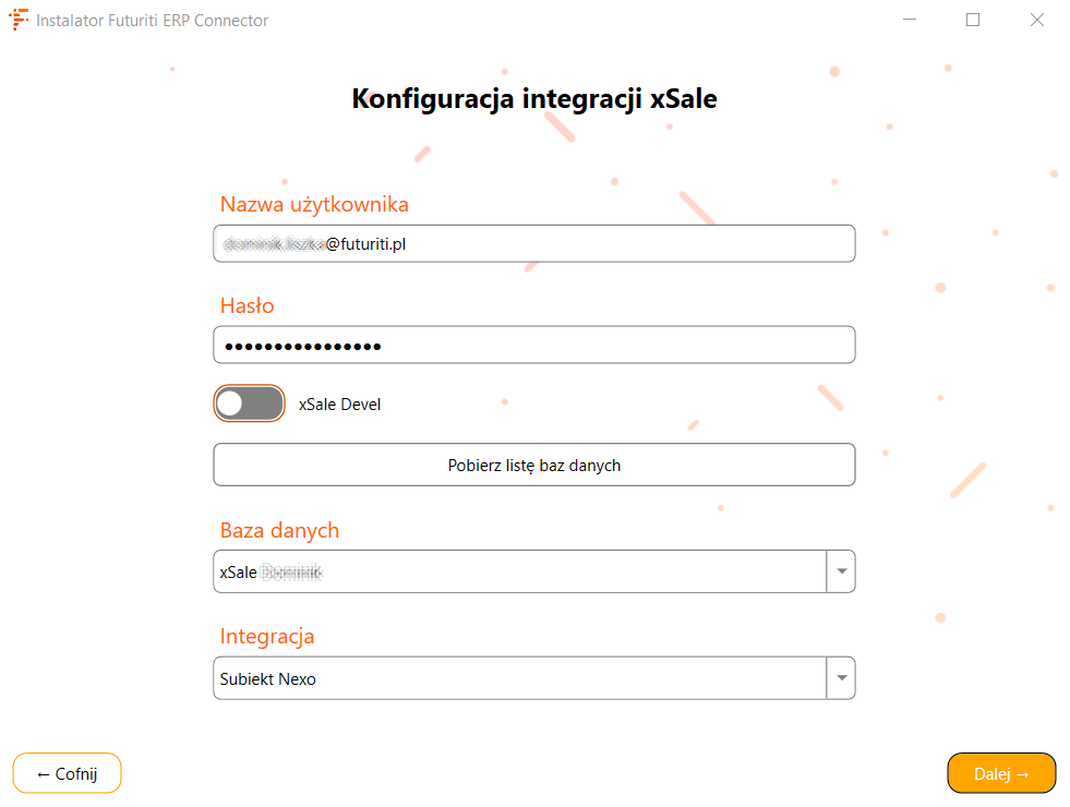- Nazwa użytkownika – email powiązany z kontem Futuriti używany do autoryzacji z xSale