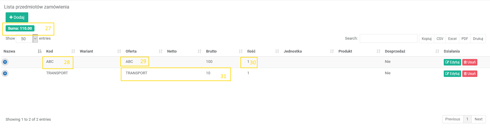 | Edycja zamówienia > Lista przedmiotów zamówienia | Suma | 27 | Sales -> Orders -> View-> Order Totals | Grand Total | 10 | |