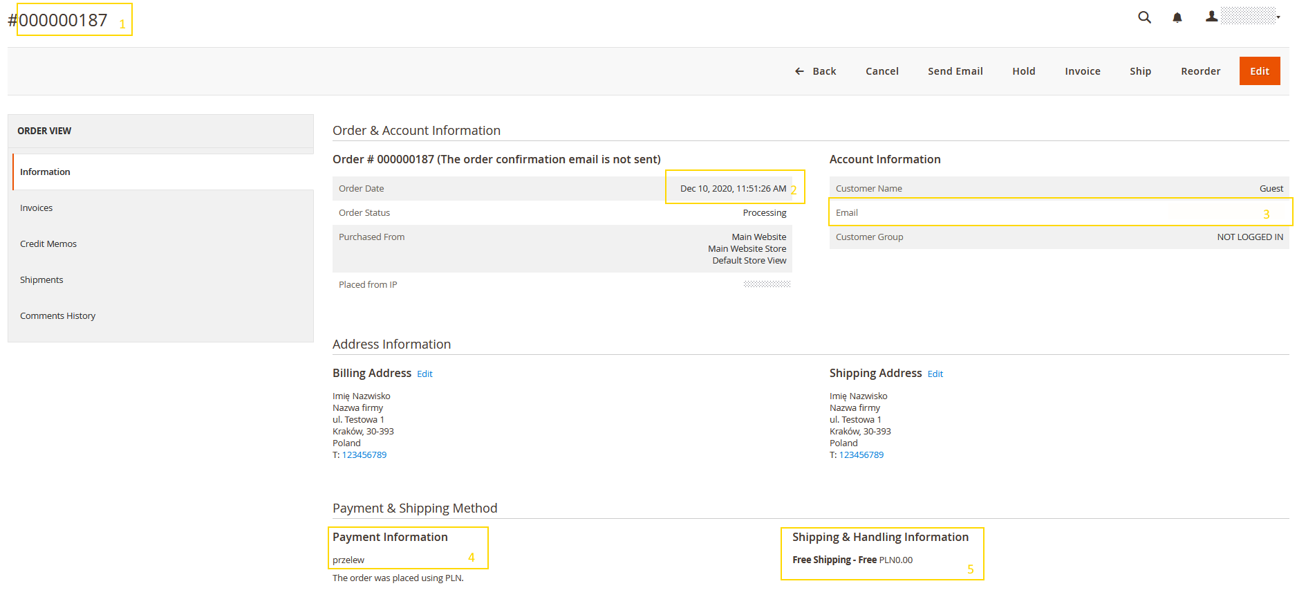 Zamówienia z Magento są przekazywane do xSale jako „Zamówienie sprzedaży”. Poniżej znajduje się mapowanie pól. Tabela zawiera odpowiedniki pól z xSale i Magento wraz z numerami pól widocznymi na zrzutach ekranu.
