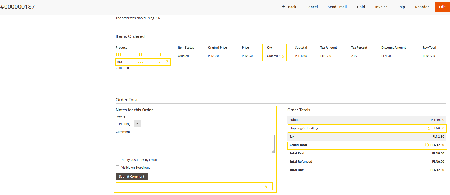 | Edycja zamówienia > Lista przedmiotów zamówienia | Oferta | 29 | Sales -> Orders -> View-> Items Ordered -> Product | SKU | 7 | |