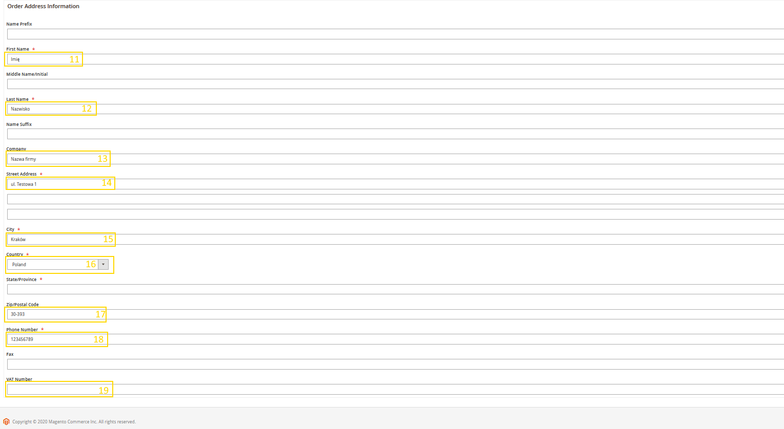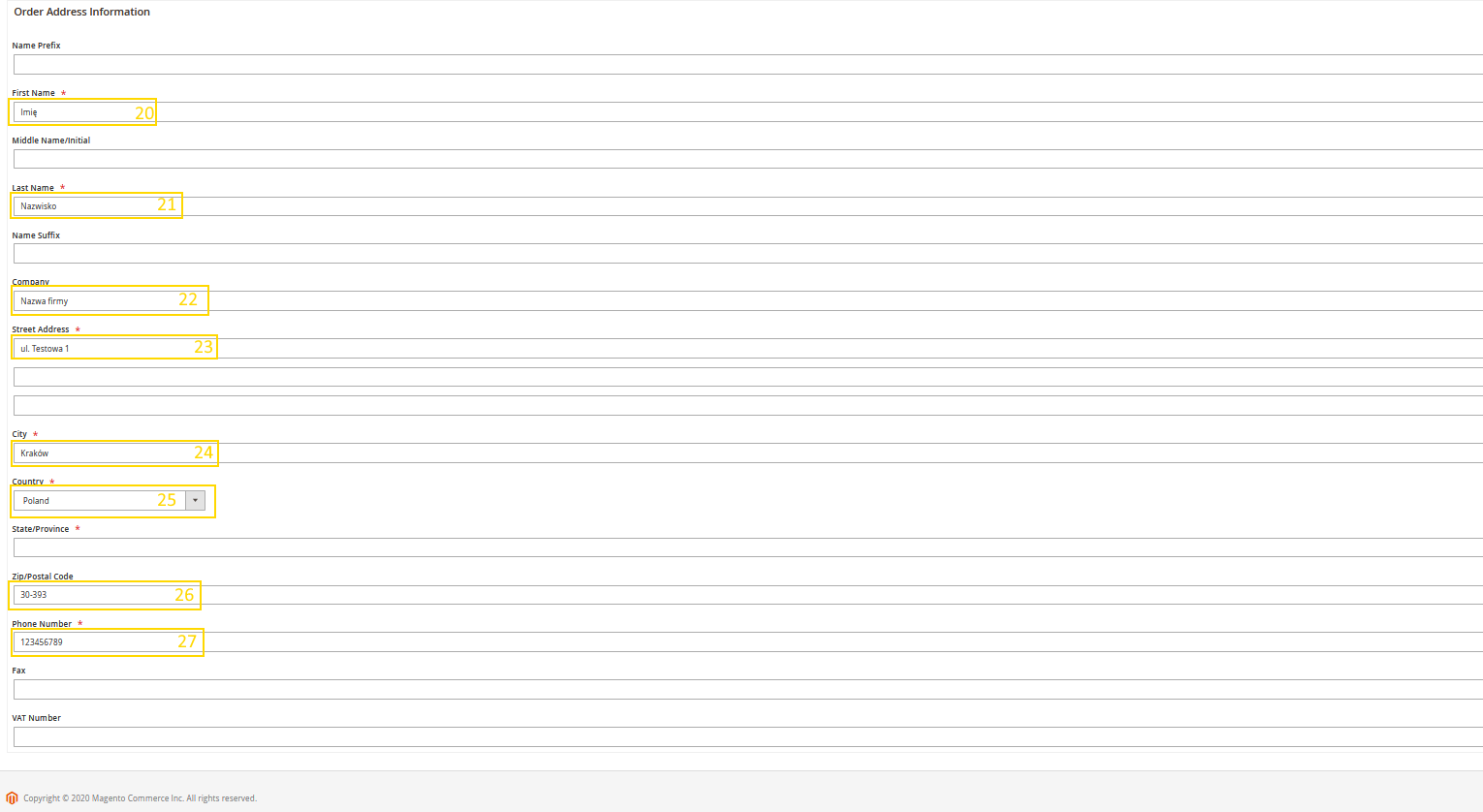 | Edycja zamówienia > Formularz adresu > Kupujący | Nazwa | 18 | Sales -> Orders -> View-> Addres Information -> Billing Address -> Edit | First Name & Last Name | 11 & 12 | |